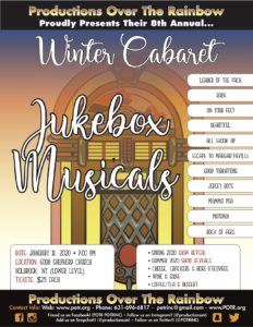 | PRODUCTIONS OVER THE RAINBOW PROUDLY PRESENTS…. Juke Box Musicals – An Evening CabaretTickets: $25 ea, and includes: Hors D’Oeuvres Cheese & Crackers Wine & Soda Coffee / Tea & Dessert |